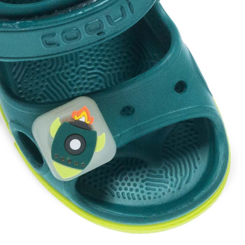 Παιδικά πέδιλα θαλάσσης από το brand Coqui σε πράσινο-λαχανί χρώμα με σχέδια διαστημικών θεμάτων. Σταθερό και διασκεδαστικό.