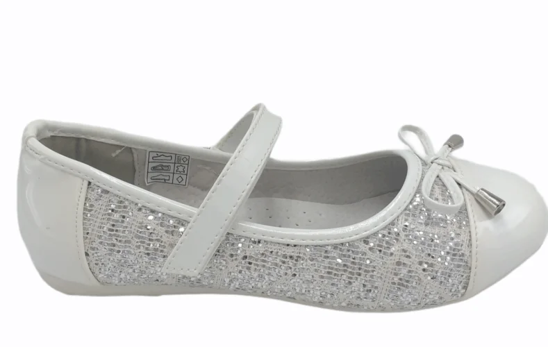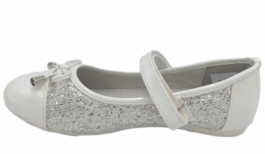 Λευκή λουστρίν μπαλαρίνα με ασημί γκλίντερ και διακοσμημένη με φιογκάκι. Δερμάτινος ανατομικός πάτος. Ιδανική και για επίσημες εμφανίσεις.