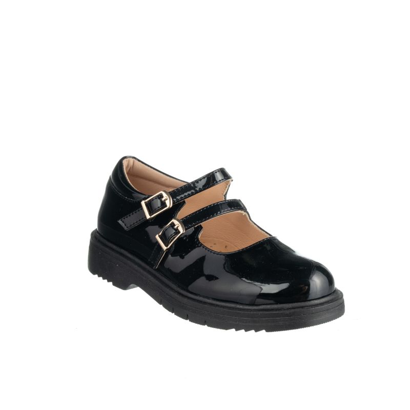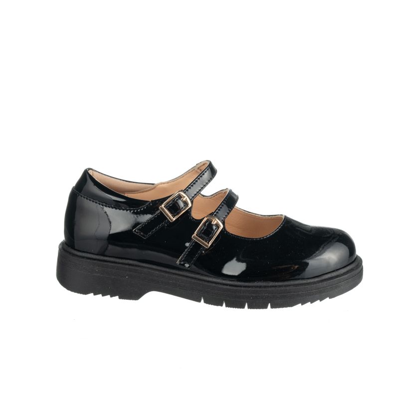 Παιδική δερμάτινη, ανατομική μπαλαρίνα σε μαύρο χρώμα . Εξωτερικά λουστρίνι με 2 λουράκια δέσιμο στο κουτεπιέ για σταθερότητα στο πόδι και να προσδώσει στυλ στην εμφάνιση.